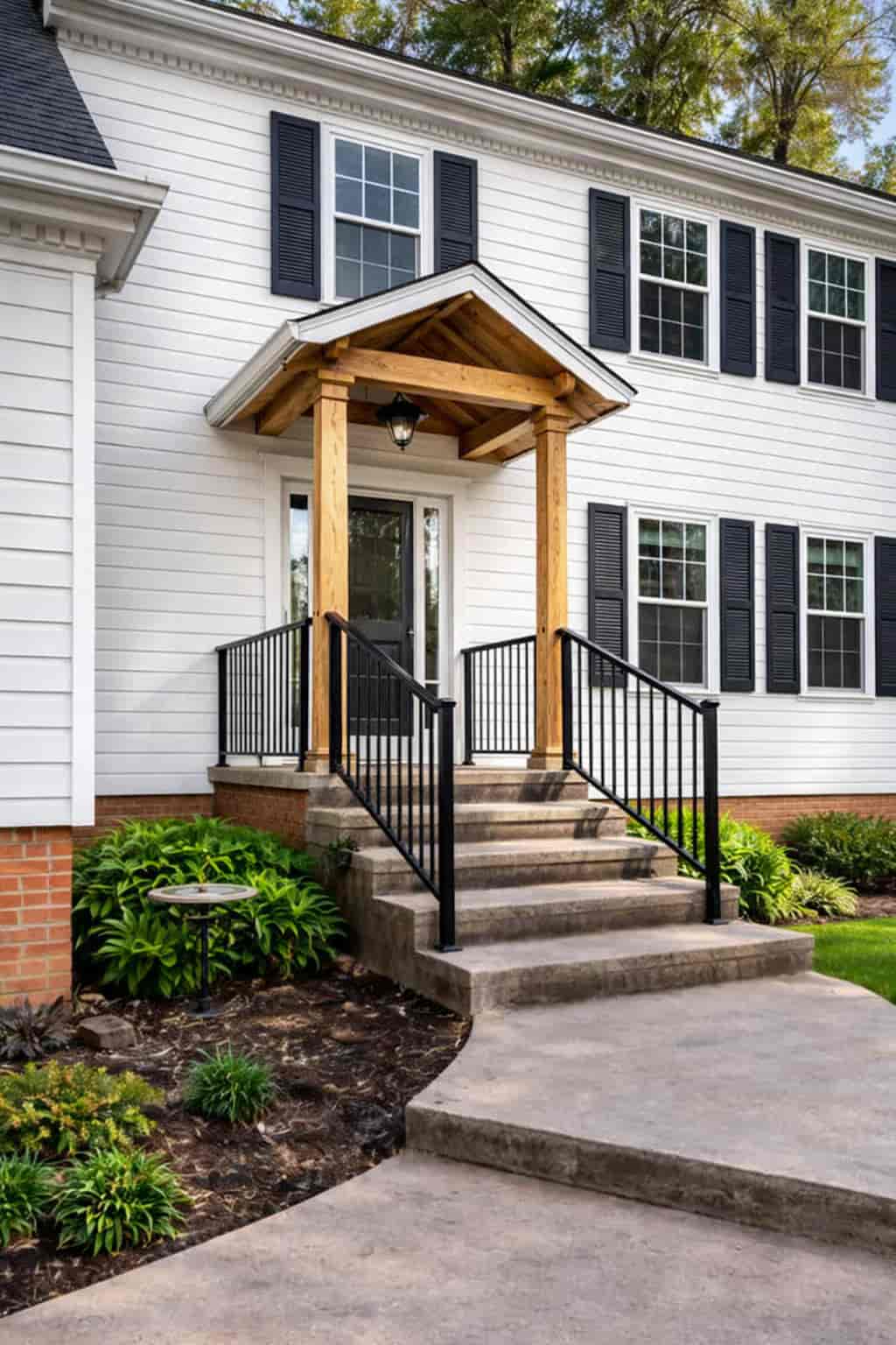 Custum front entry upgrade including demolition of existing concrete steps and sidewalk, followed by installation of new concrete, covered porch structures, and updated railings.